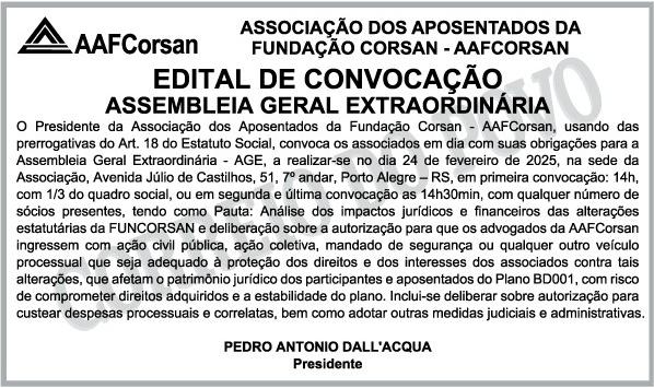 A Associação dos Aposentados da Fundação Corsan (AAFCorsan) é sua aliada nos momentos em que você mais precisa. Em tempos de privatização e mudanças constantes, trabalhamos incansavelmente para proteger seus direitos, lutar pela justiça e garantir um futuro digno.