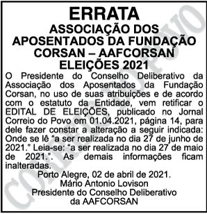 Foi publicado nesta quinta-feira (1) no jornal Correio do Povo, o edital de convocação aos associados para participação nas eleições para diretoria executiva da AAFCorsan, que ocorrem no dia 27 de maio próximo. Na publicação constou equivocadamente o dia 27 de junho, mas já foi providenciada uma errata que você pode acessar aqui. Já nesta sexta-feira (2) inicia-se o período para apresentação de chapas, que encerra no próximo dia 16 de abril. As inscrições serão realizadas por meio eletrônico, sendo que os documentos devem ser encaminhados para o e-mail aafcorsan@aafcorsan.com.br em formato PDF.